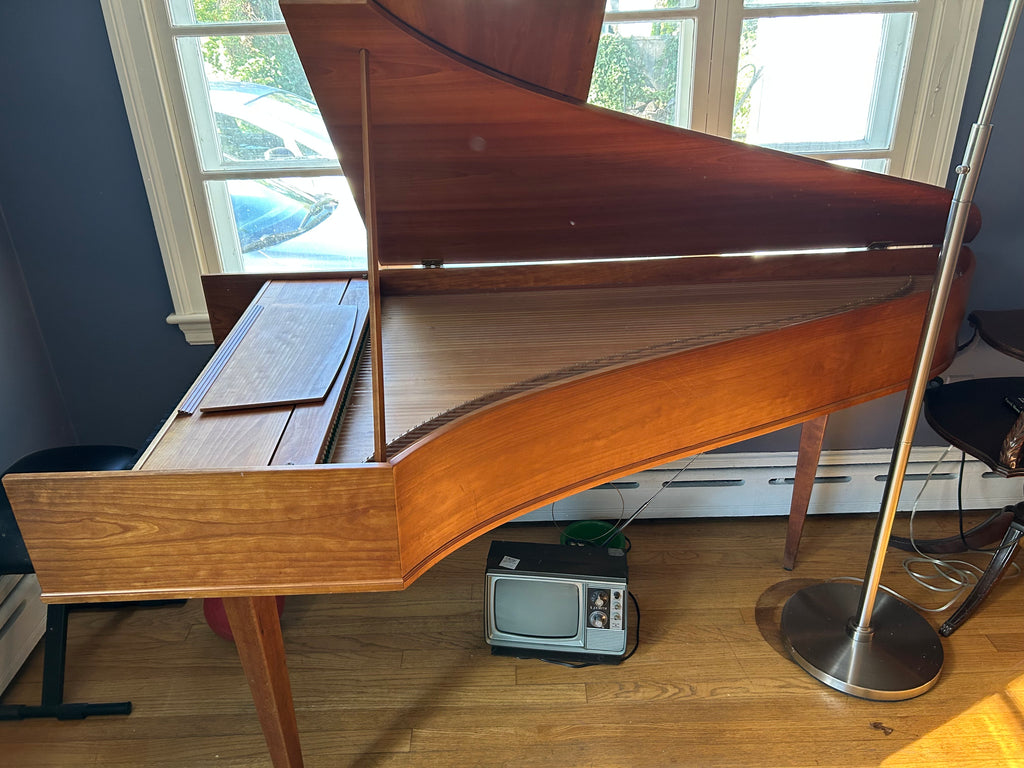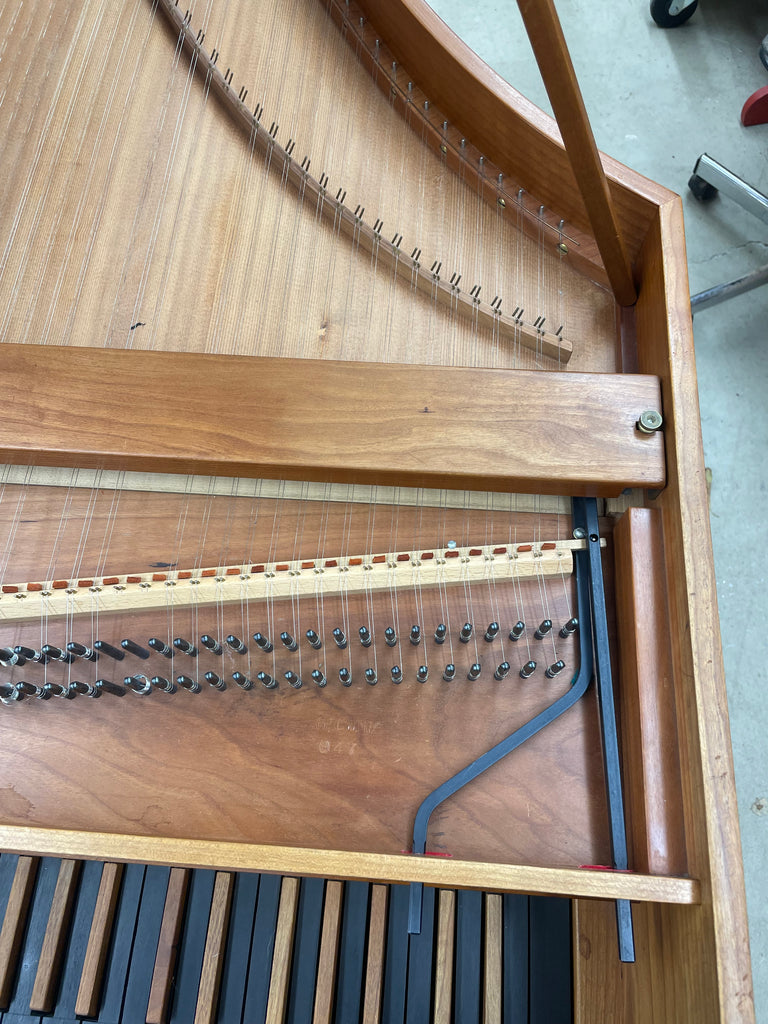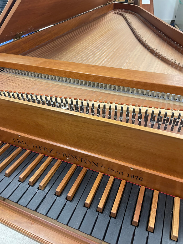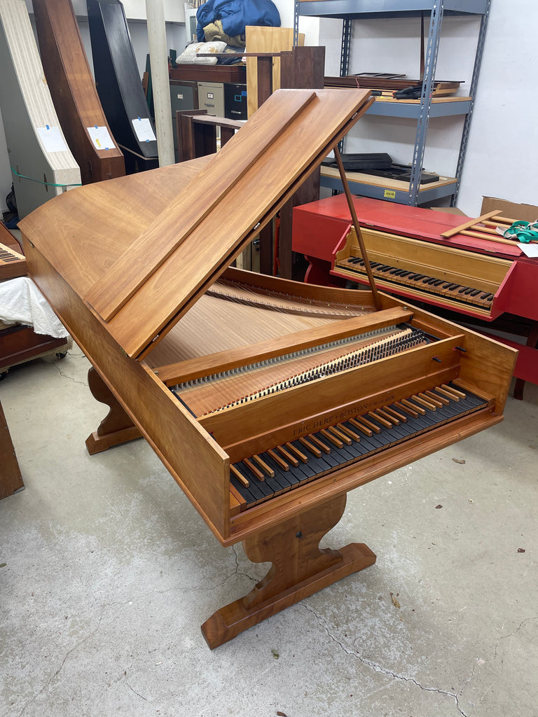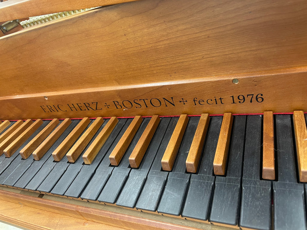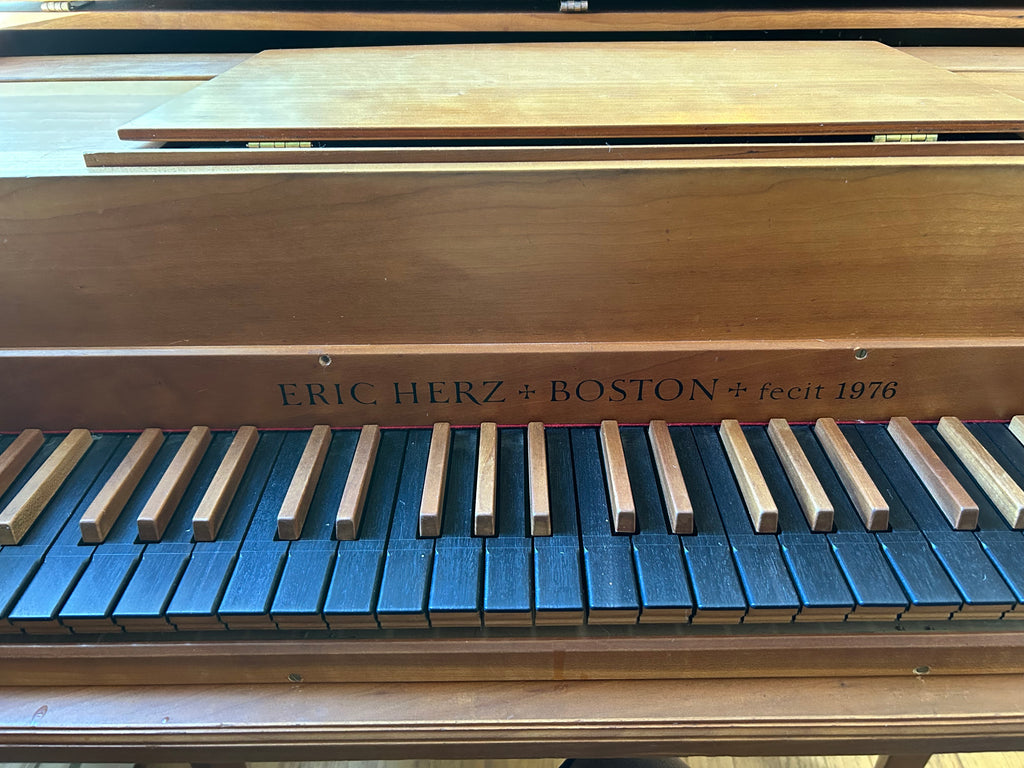 Eric Herz German single - Model S - shop built in 1976.  AA- f"' transposing 8'8' with buff stop.  Case of hand rubbed/ waxed cherry with keyboard of ebony with cherry sharps.  Rebuilding in progress 11/25 in our shop.  These photos show the instrument in arrival condition- tapered straight leg stand included, and two photos of a recently completed rebuild.  With full kit; optional cover.  Available 90 days from contract and offered at $8900.