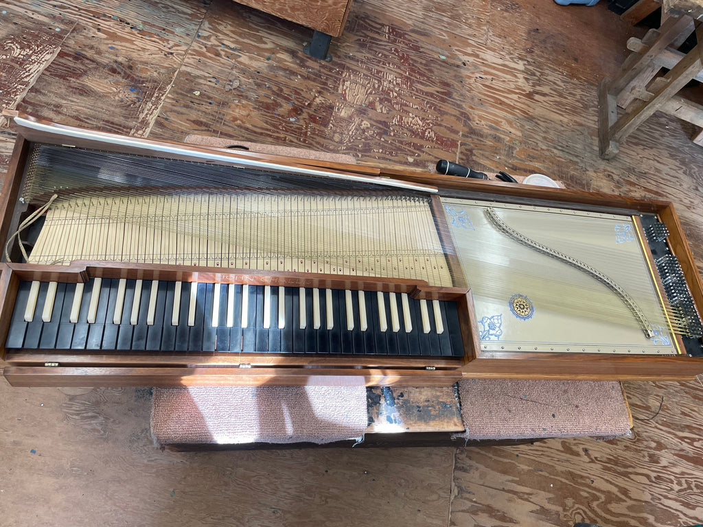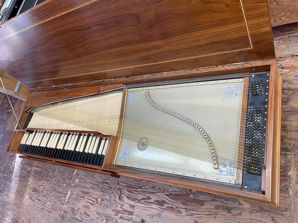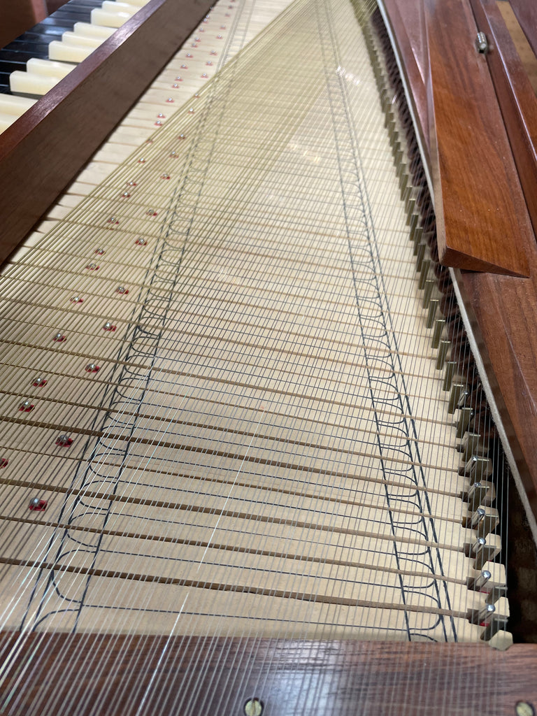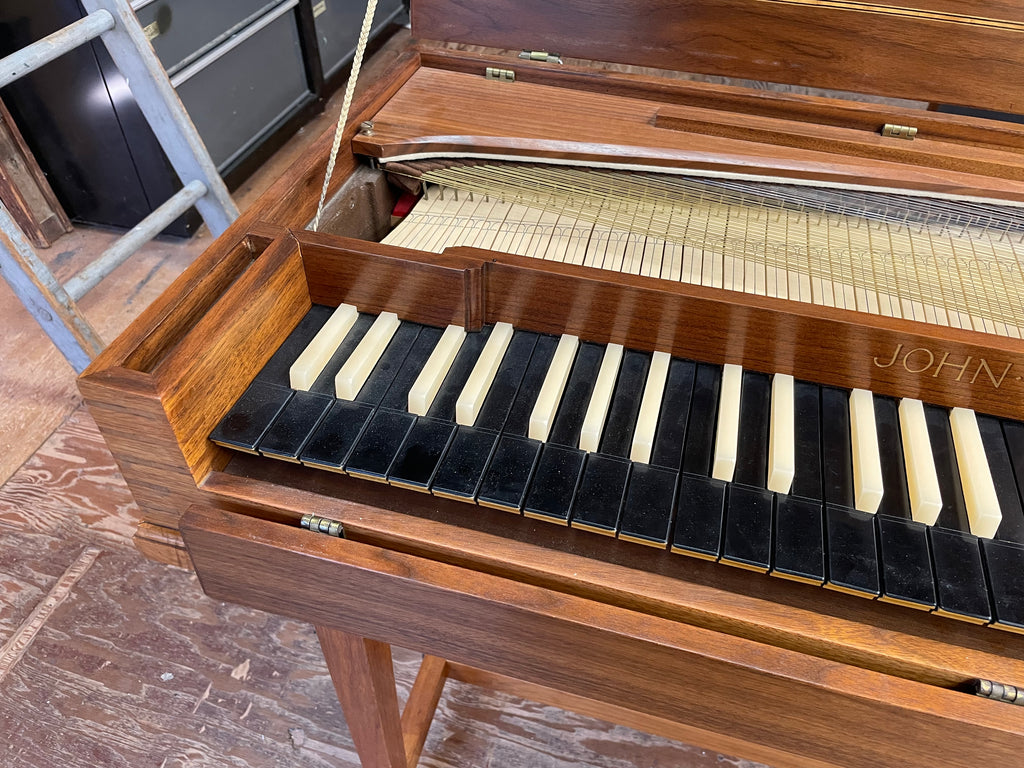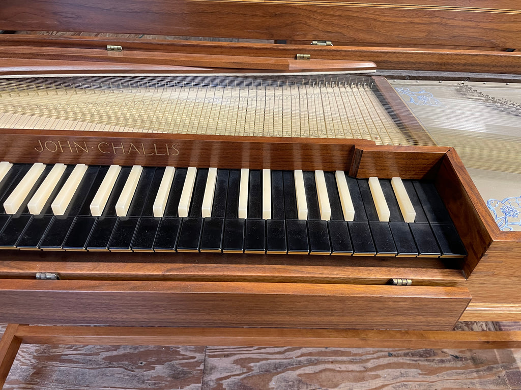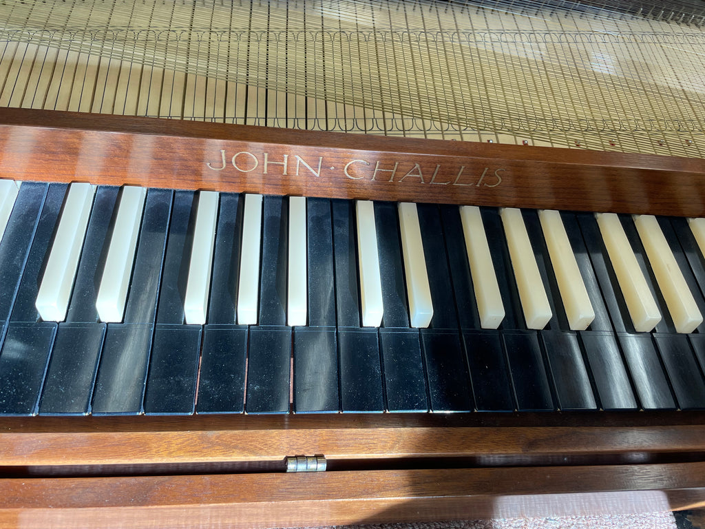Unfretted Clavichord by John Challis, Opus 295 from 1966. Mahogany case with tapered leg trestle stand. GG-f"' at 440 HZ. Elaborate brass hinges and the Challis signature cast frame and aluminum soundboard. These instruments require no maintenance and will provide a lifetime of musical enjoyment. 58" x 17" with a 6 1/4" octave. This was a university professor's office instrument, and our photos show the instrument in its arrival condition. Offered at $7500.