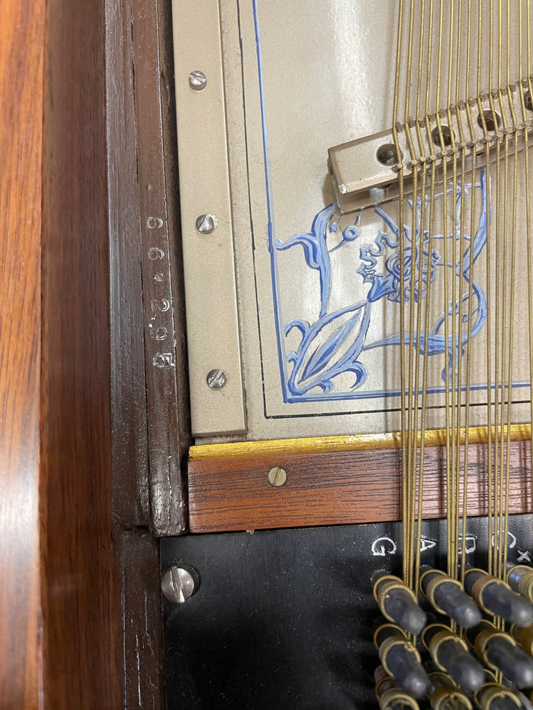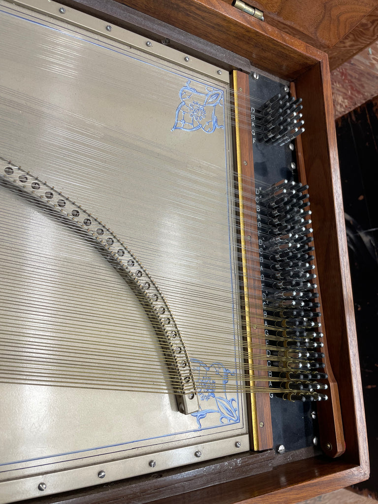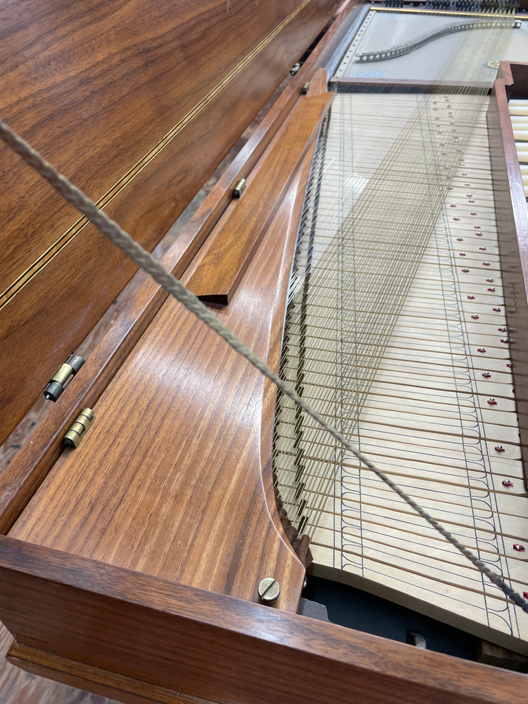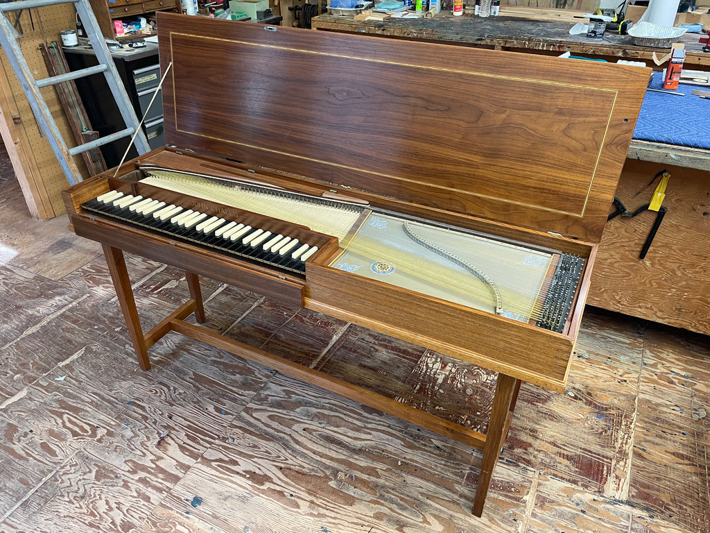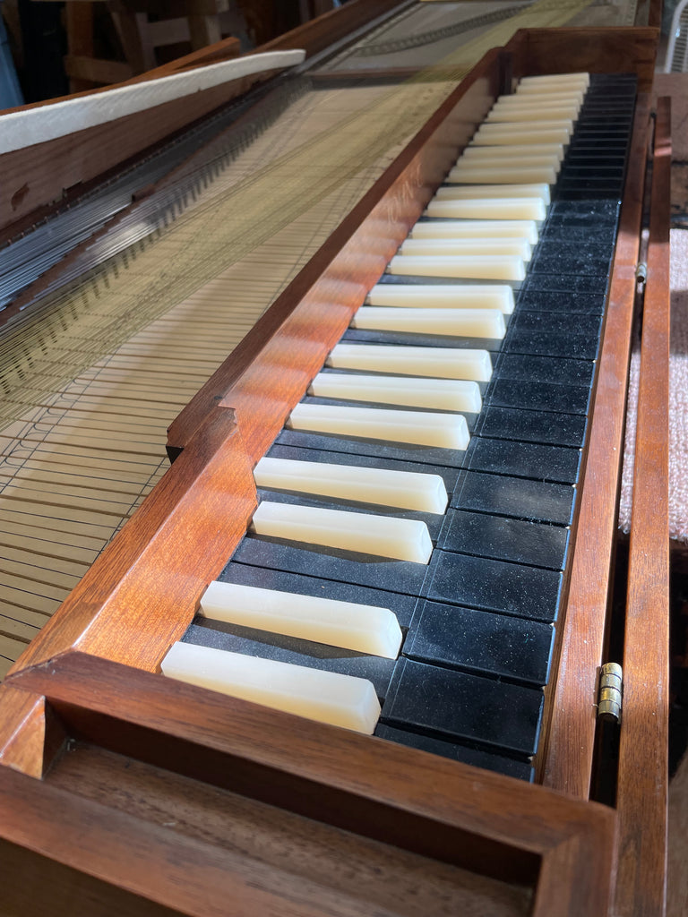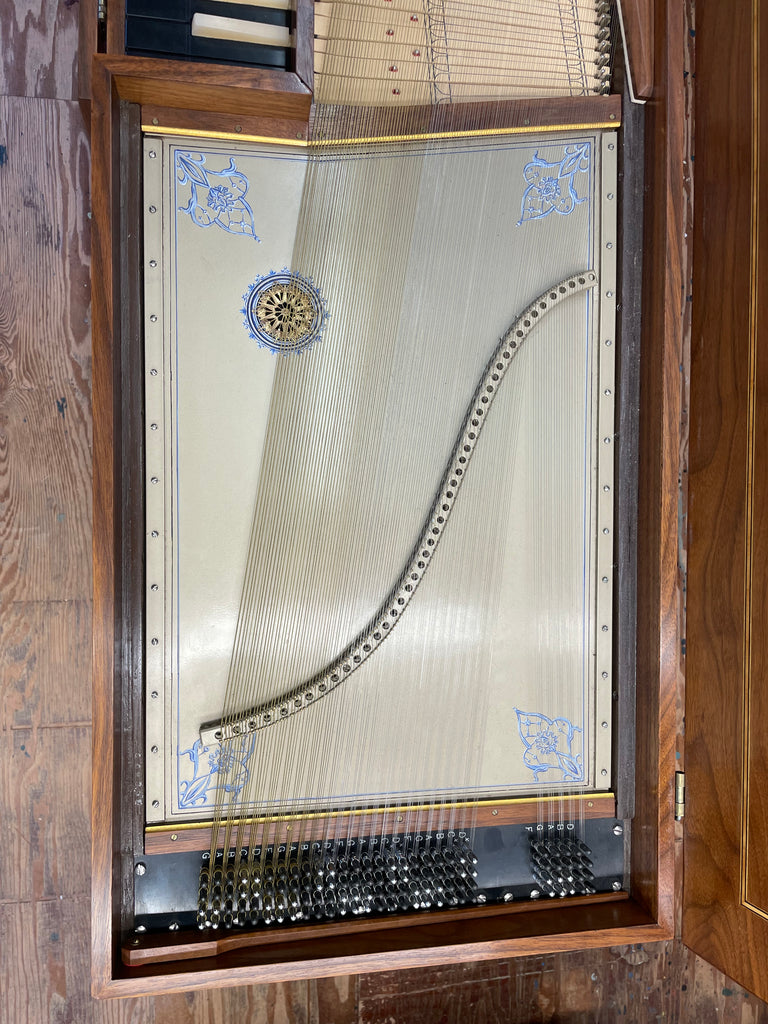 Unfretted Clavichord by John Challis, Opus 295 from 1966. Mahogany case with tapered leg trestle stand. GG-f"' at 440 HZ. Elaborate brass hinges and the Challis signature cast frame and aluminum soundboard. These instruments require no maintenance and will provide a lifetime of musical enjoyment. 58" x 17" with a 6 1/4" octave. This was a university professor's office instrument, and our photos show the instrument in its arrival condition. Offered at $7500.