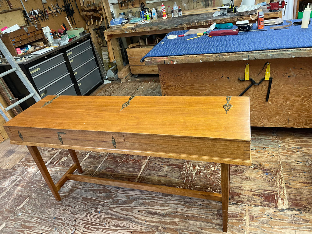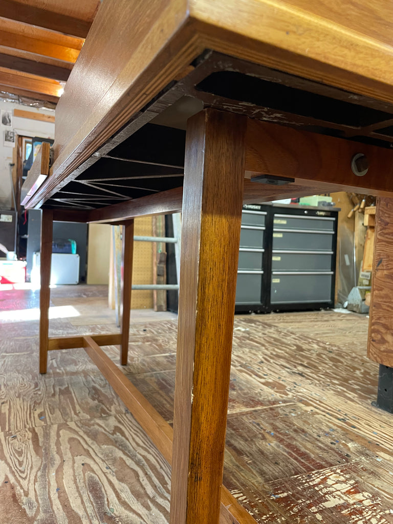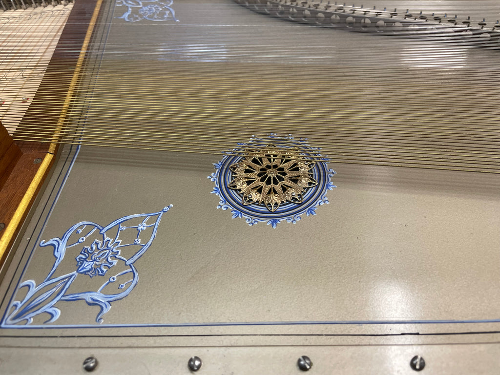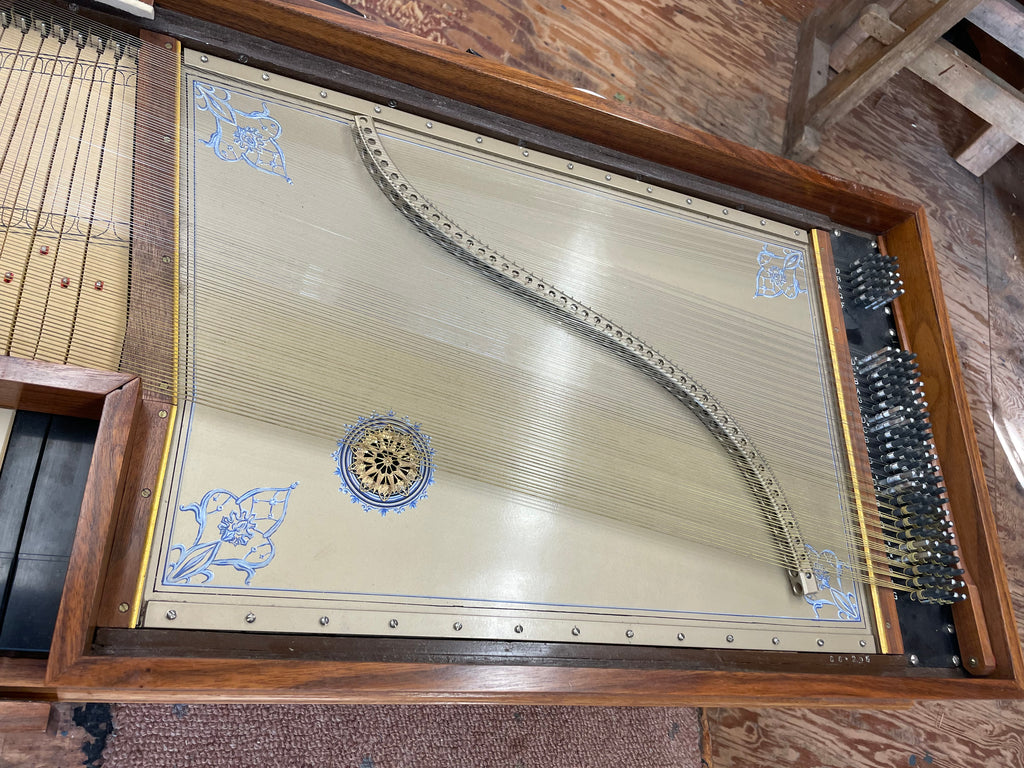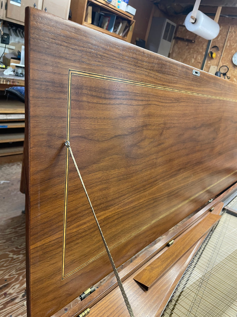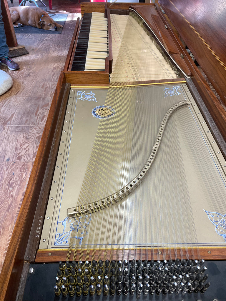 Unfretted Clavichord by John Challis, Opus 295 from 1966. Mahogany case with tapered leg trestle stand. GG-f"' at 440 HZ. Elaborate brass hinges and the Challis signature cast frame and aluminum soundboard. These instruments require no maintenance and will provide a lifetime of musical enjoyment. 58" x 17" with a 6 1/4" octave. This was a university professor's office instrument, and our photos show the instrument in its arrival condition. Offered at $7500.