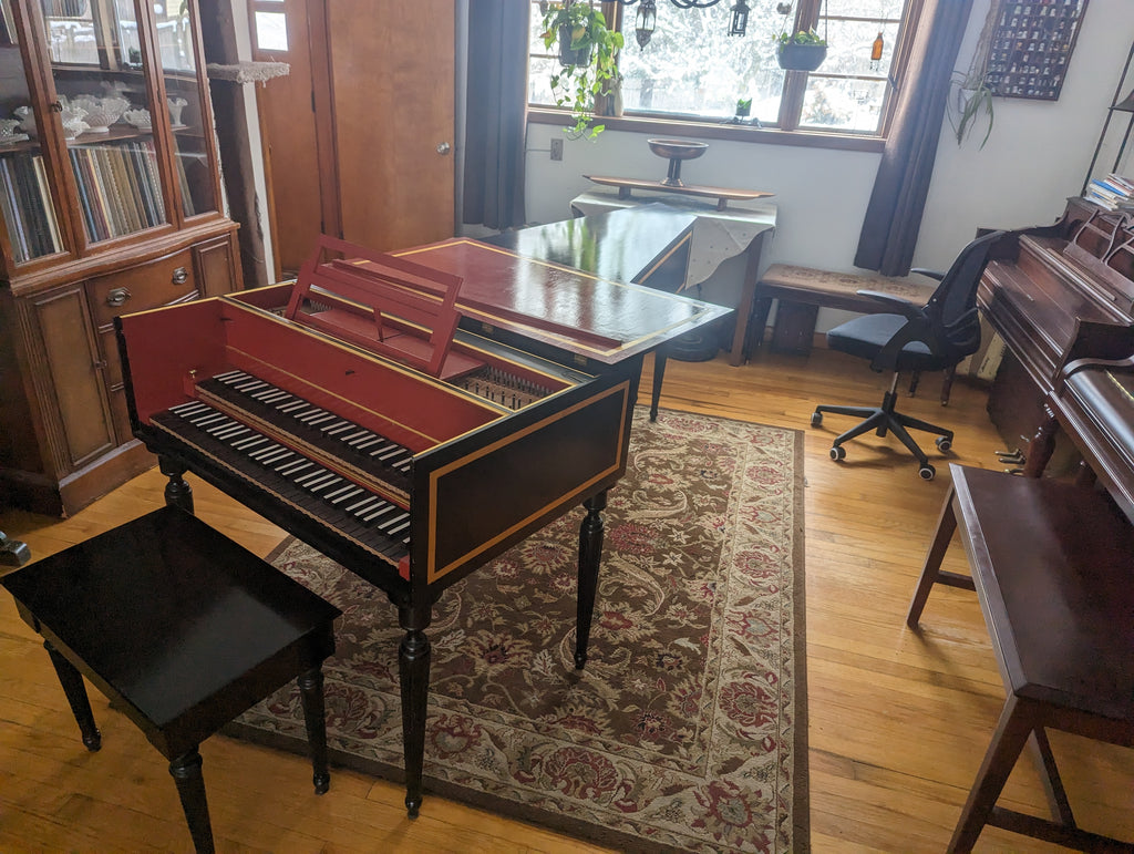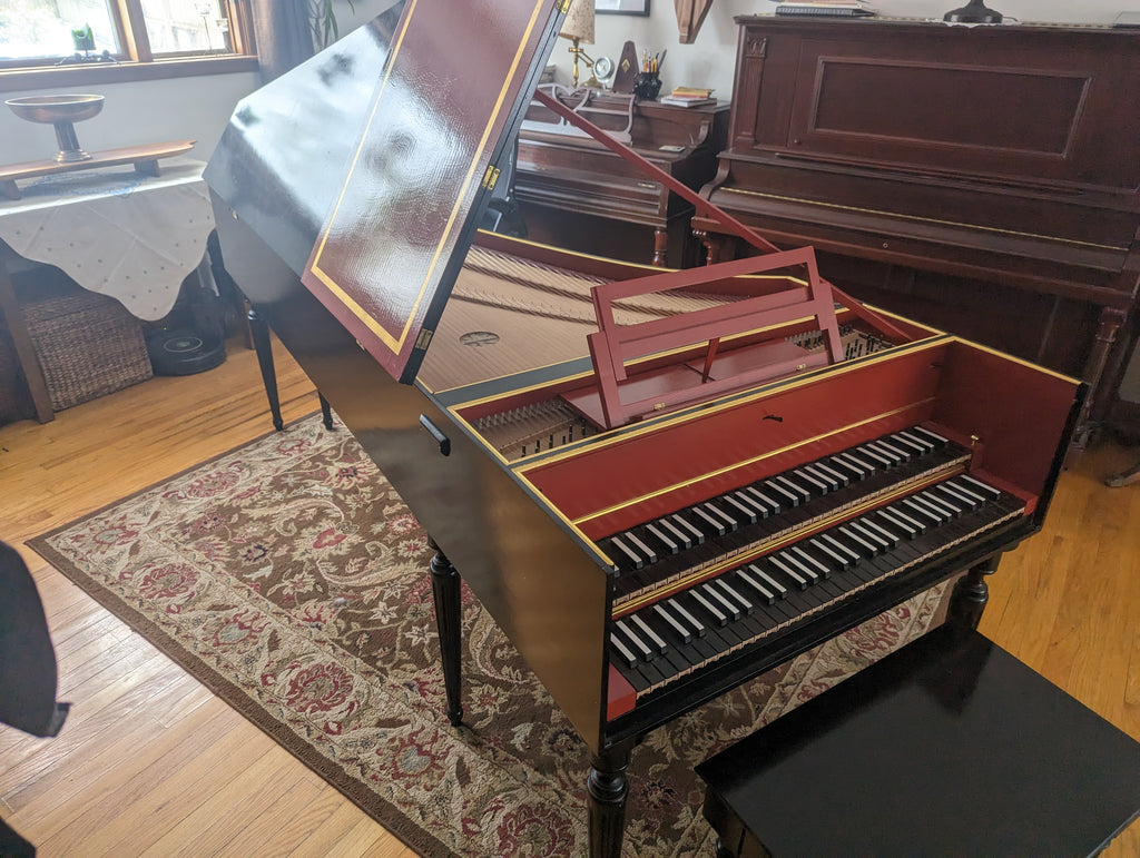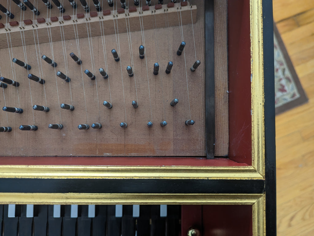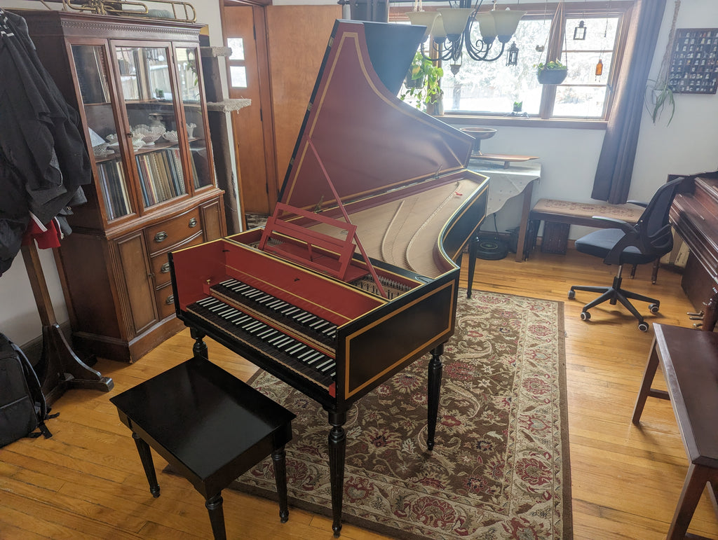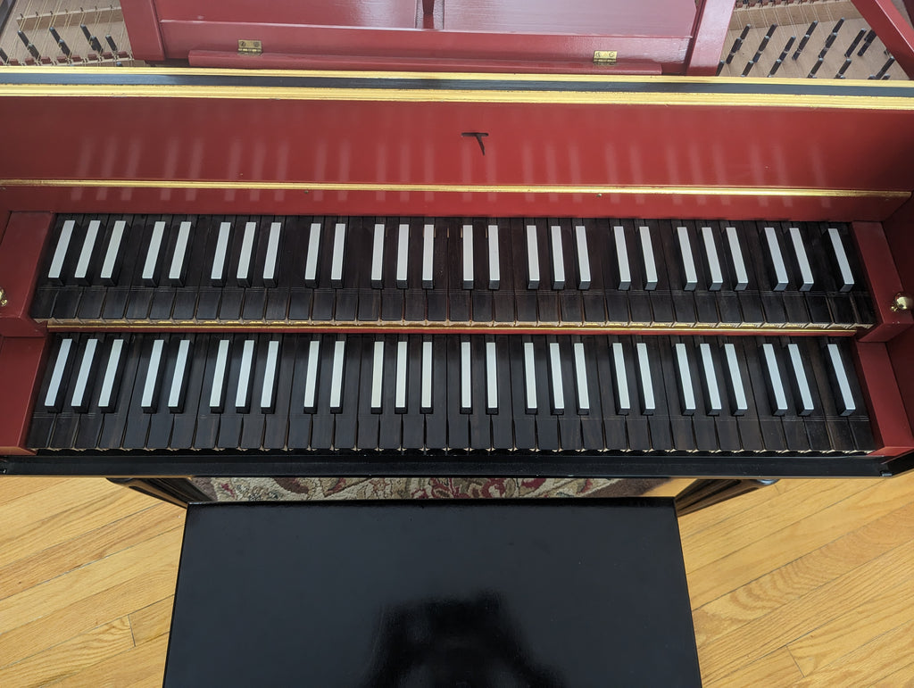 Taskin French double / FF-g”’ not transposing. 1973 design from Hubbard parts by Chaffin, TX. Three Choirs: 8'8'4' with buff stop. 6 1/4" octave span. Black Lacquer case work with red bole interior, and gold leaf banding. Reverse keyboard of ebony and bone with arcades. New style Hubbard jacks. Offered at $18,000. and available in January 2025. Located in New Haven.