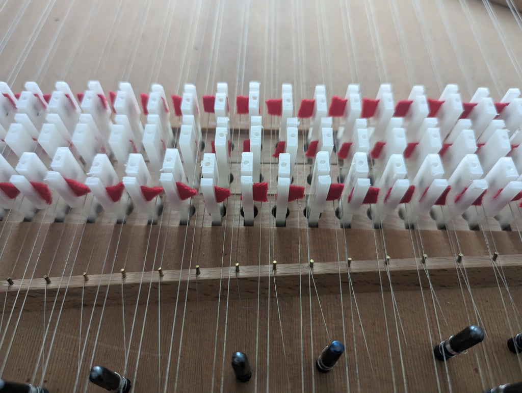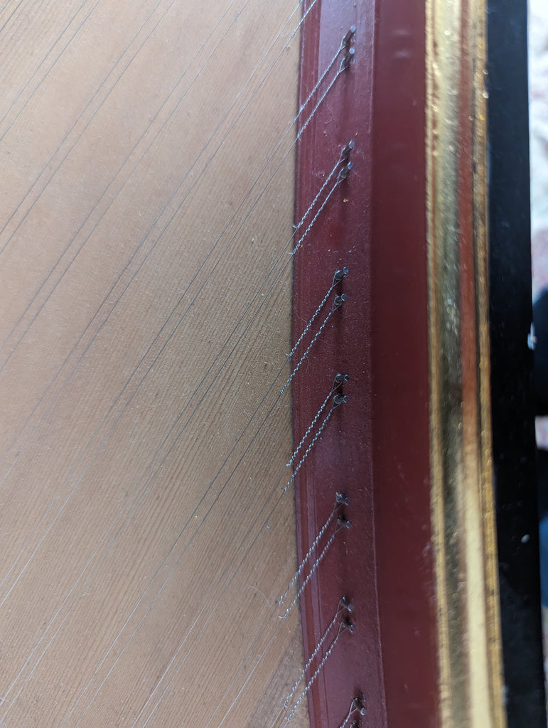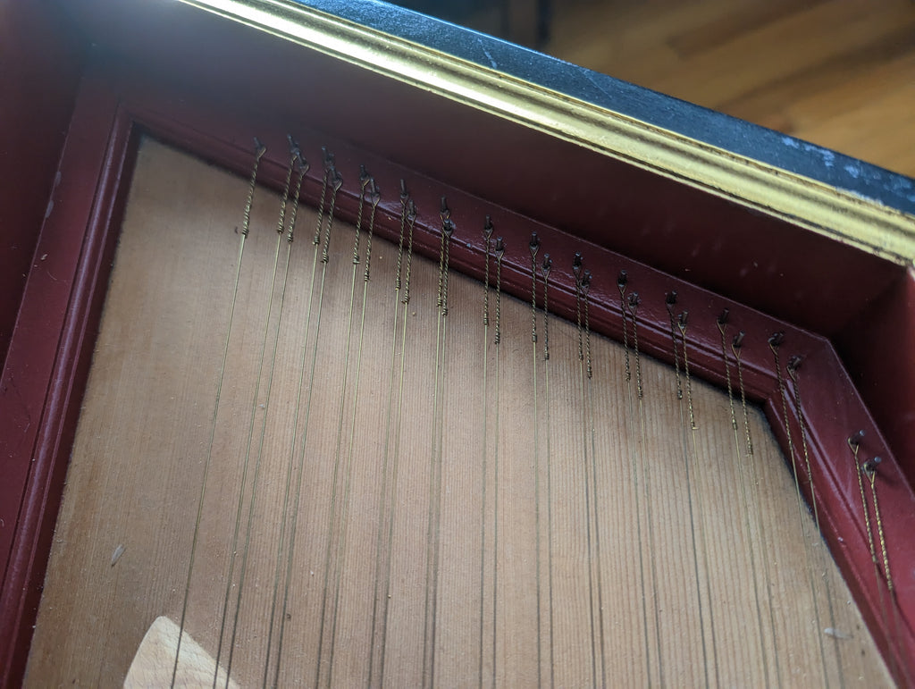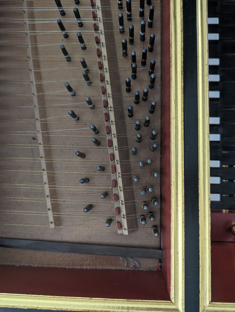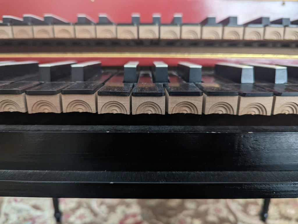 Taskin French double / FF-g”’ not transposing. 1973 design from Hubbard parts by Chaffin, TX. Three Choirs: 8'8'4' with buff stop. 6 1/4" octave span. Black Lacquer case work with red bole interior, and gold leaf banding. Reverse keyboard of ebony and bone with arcades. New style Hubbard jacks. Offered at $18,000. and available in January 2025. Located in New Haven.