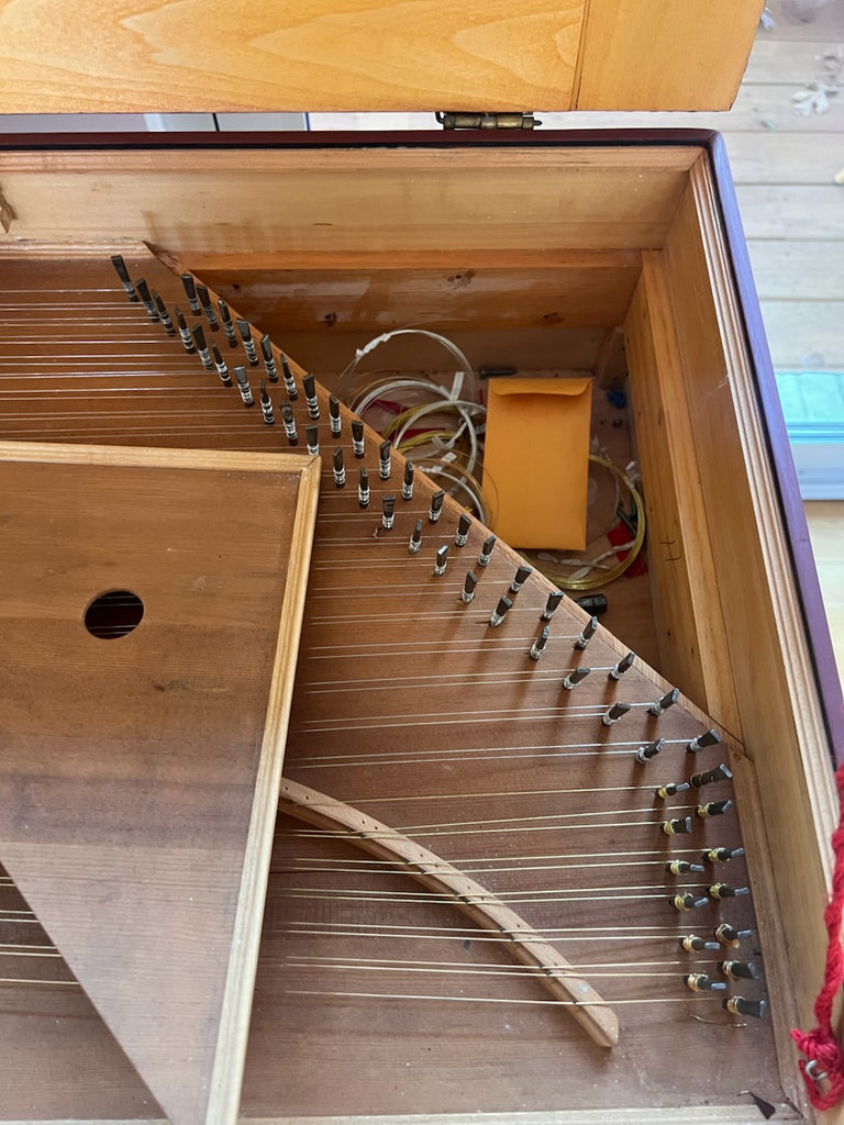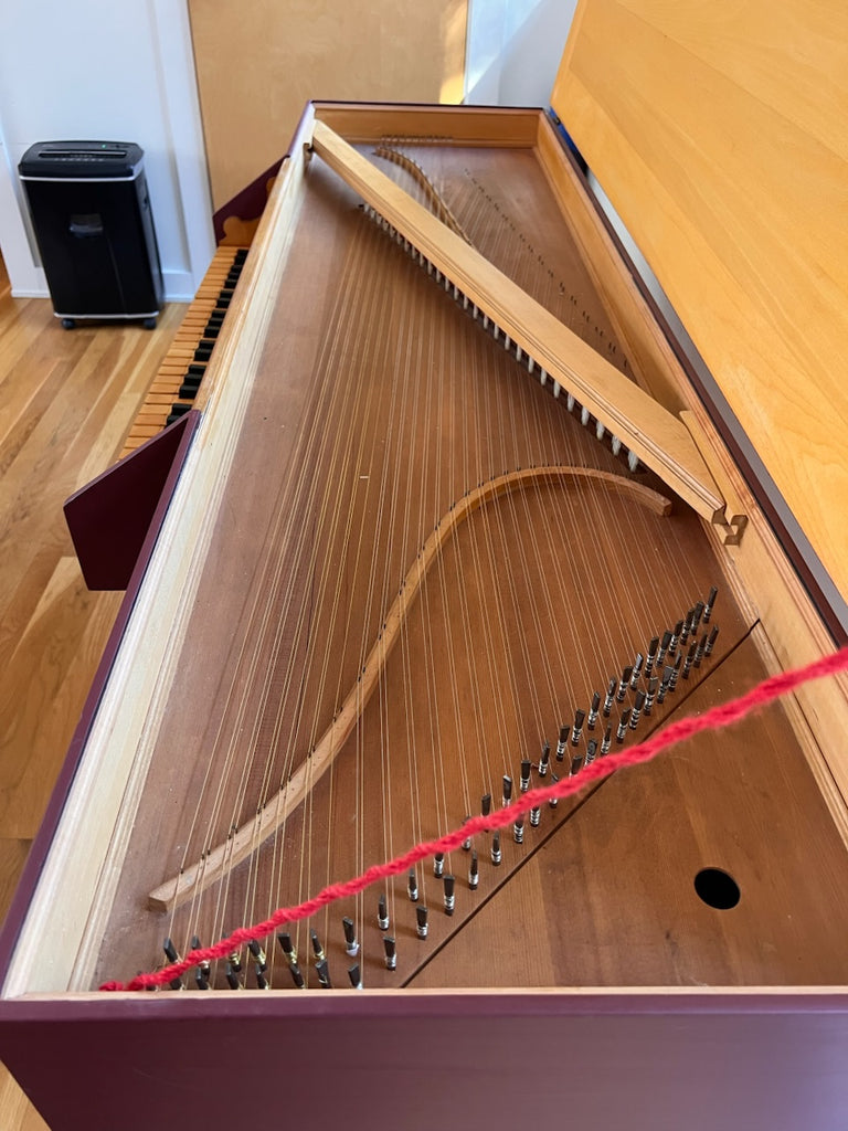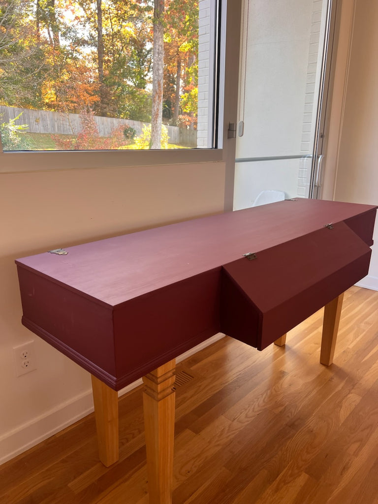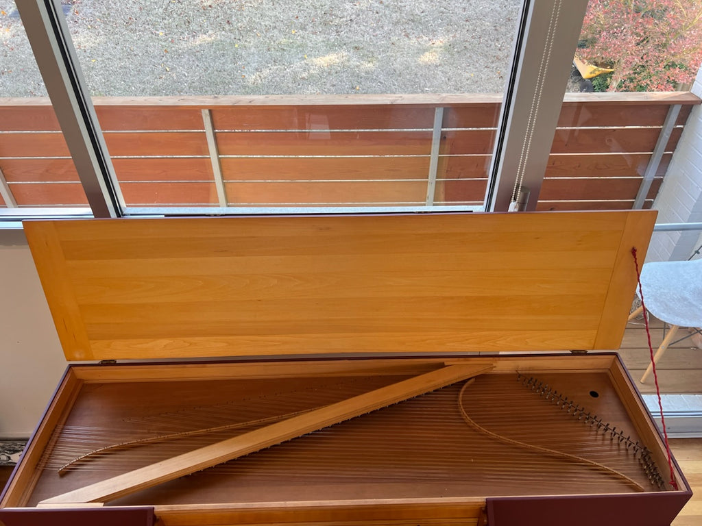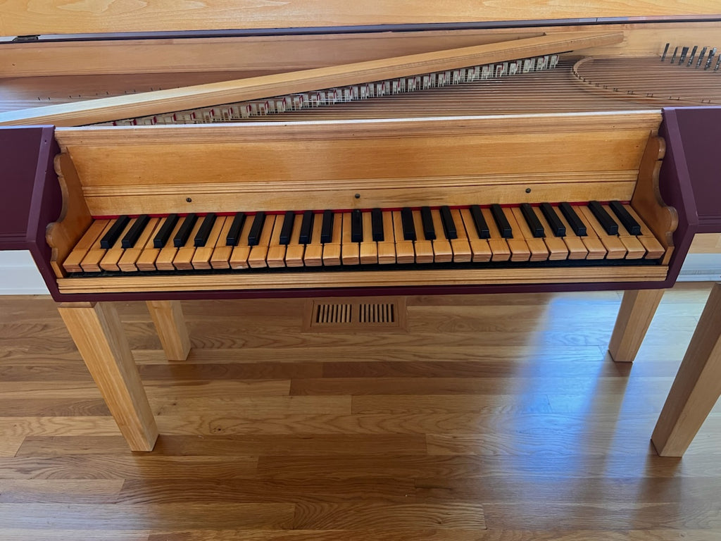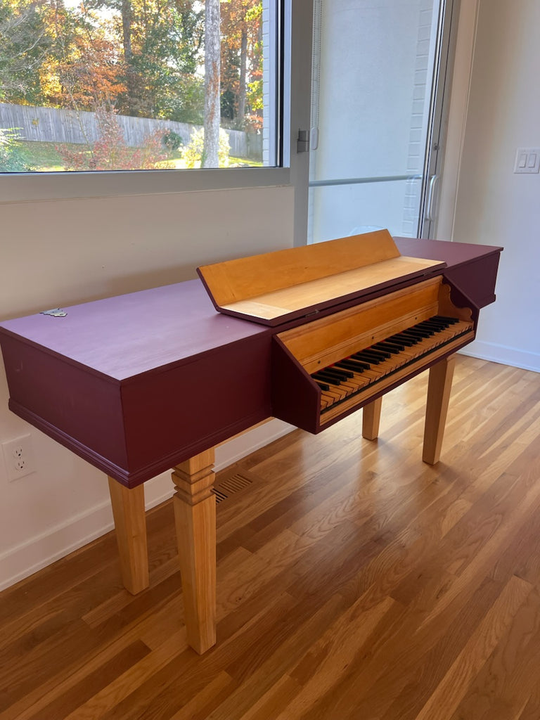 Zuckermann Italian virginal design with technical finishing by Adam Decker. BB-e”’ 54 note instrument. Case is painted New England red with a specially designed stand in natural wood. Located in Atlanta, GA and offered at $3200.