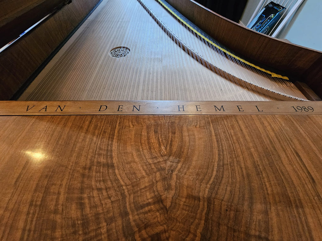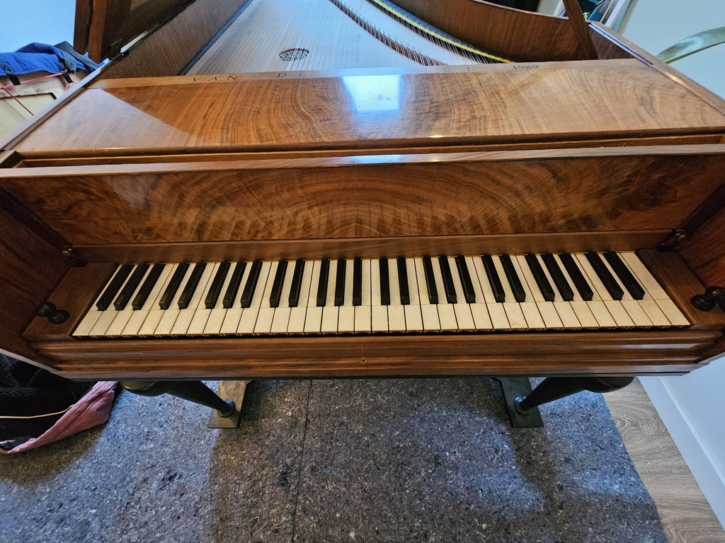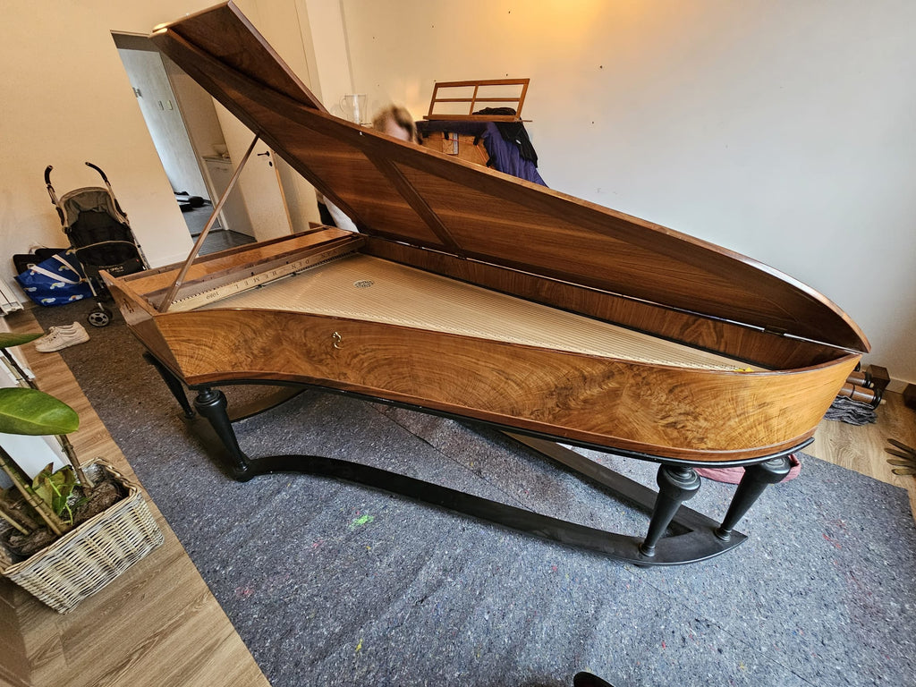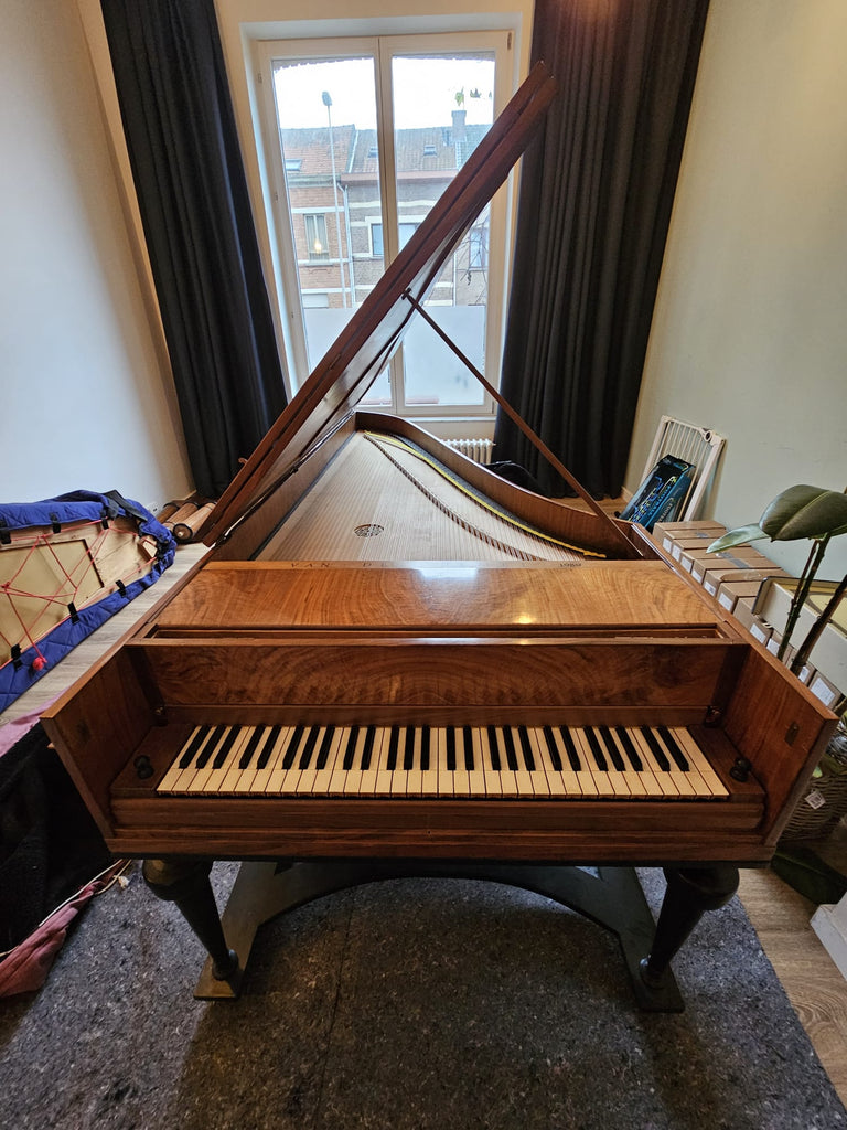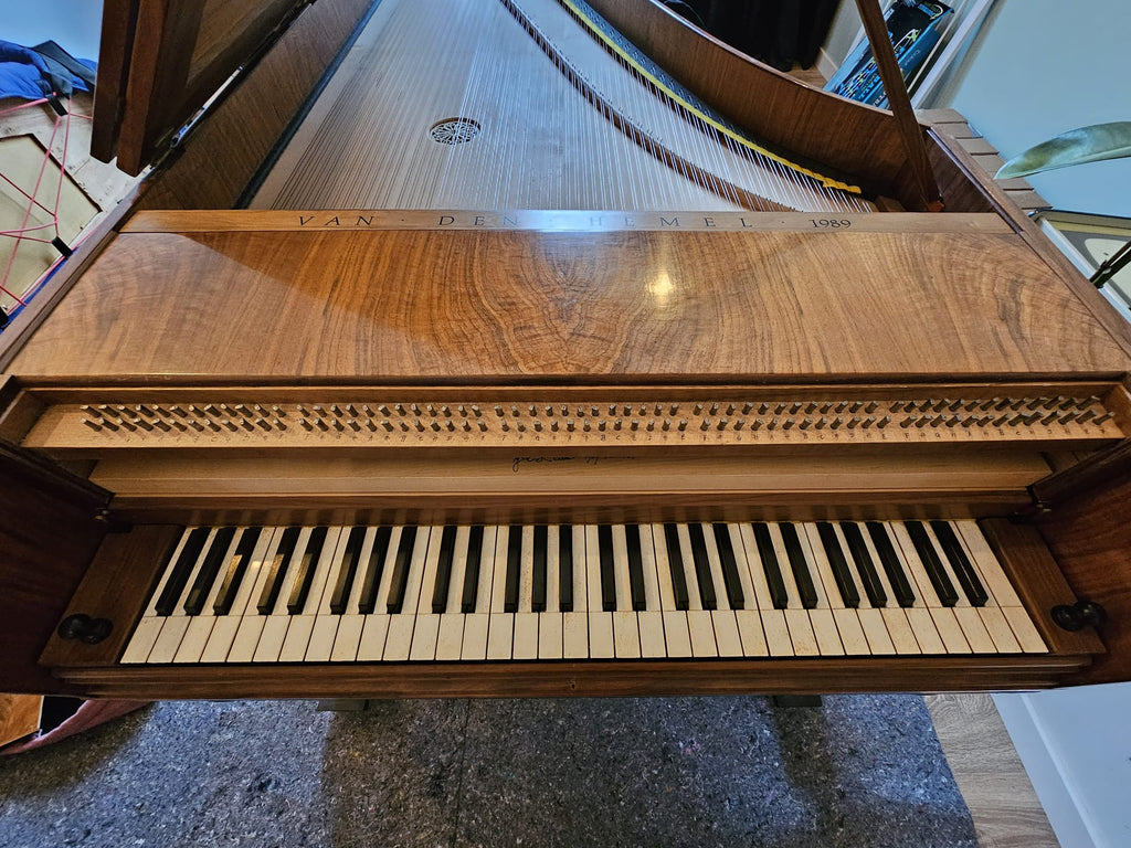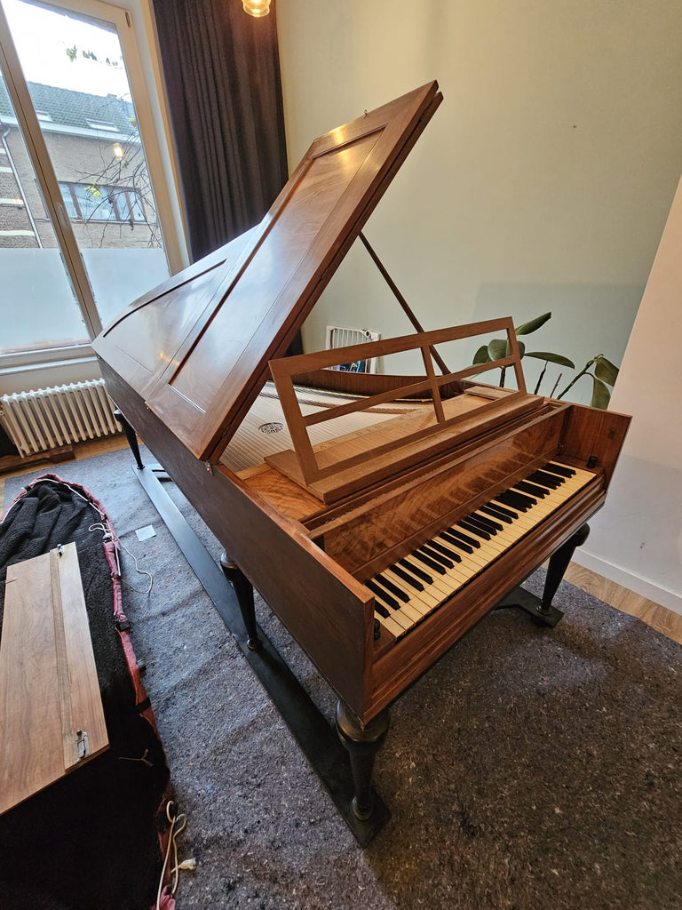 Fortepiano by Jan van den Hemel built in 1989 after Silbermann 1749 (Germanisches National Museum in Nuremberg). The instrument is double strung throughout. Keyboard is FF- f"' of bone and ebony. Case in crotch walnut with inset panels. Full turned table stand. Recorded on 5 CD's by Miklos Spanyl and Jacques Ogg. Priced at 25,000 Euro. Currently located in Ghent, Belgium, please e-mail to discuss the instrument and pricing.