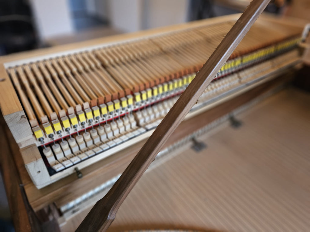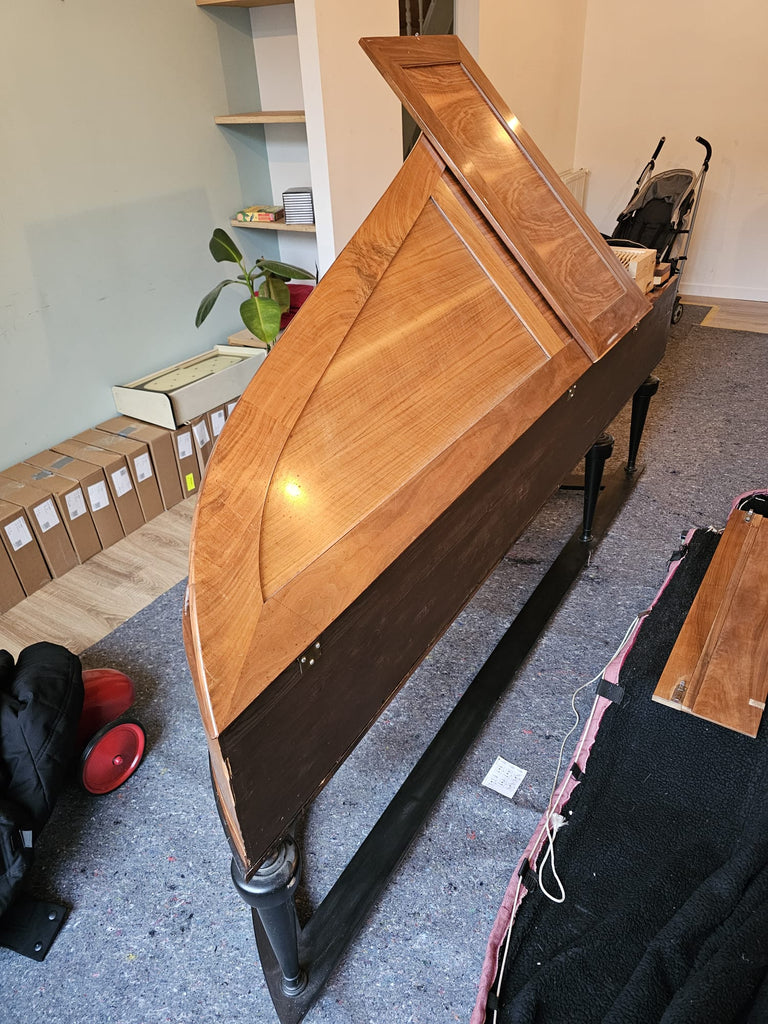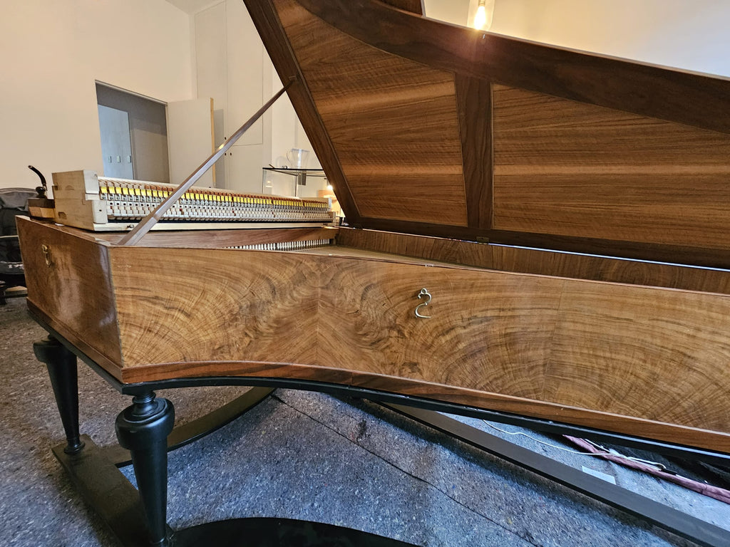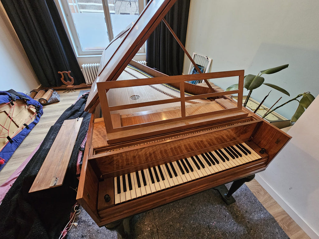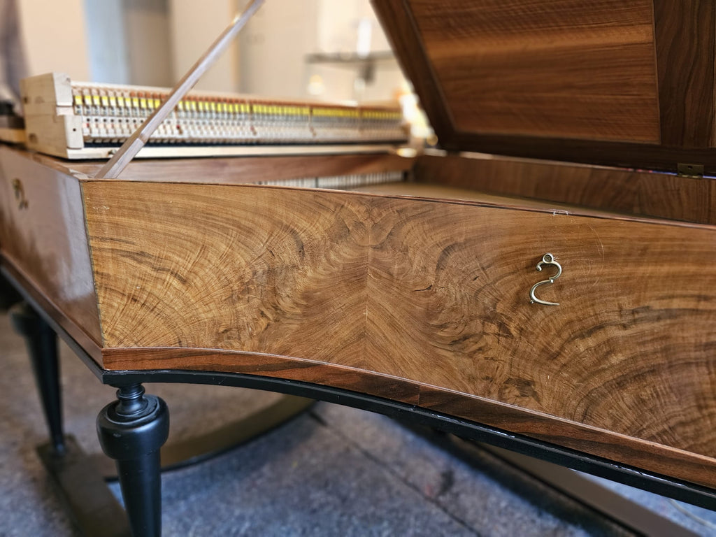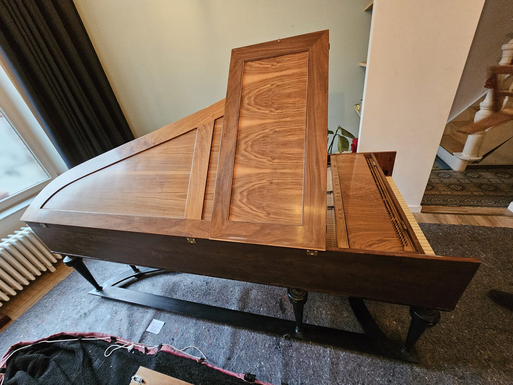 Fortepiano by Jan van den Hemel built in 1989 after Silbermann 1749 (Germanisches National Museum in Nuremberg). The instrument is double strung throughout. Keyboard is FF- f"' of bone and ebony. Case in crotch walnut with inset panels. Full turned table stand. Recorded on 5 CD's by Miklos Spanyl and Jacques Ogg. Priced at 25,000 Euro. Currently located in Ghent, Belgium, please e-mail to discuss the instrument and pricing.