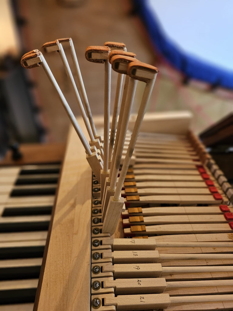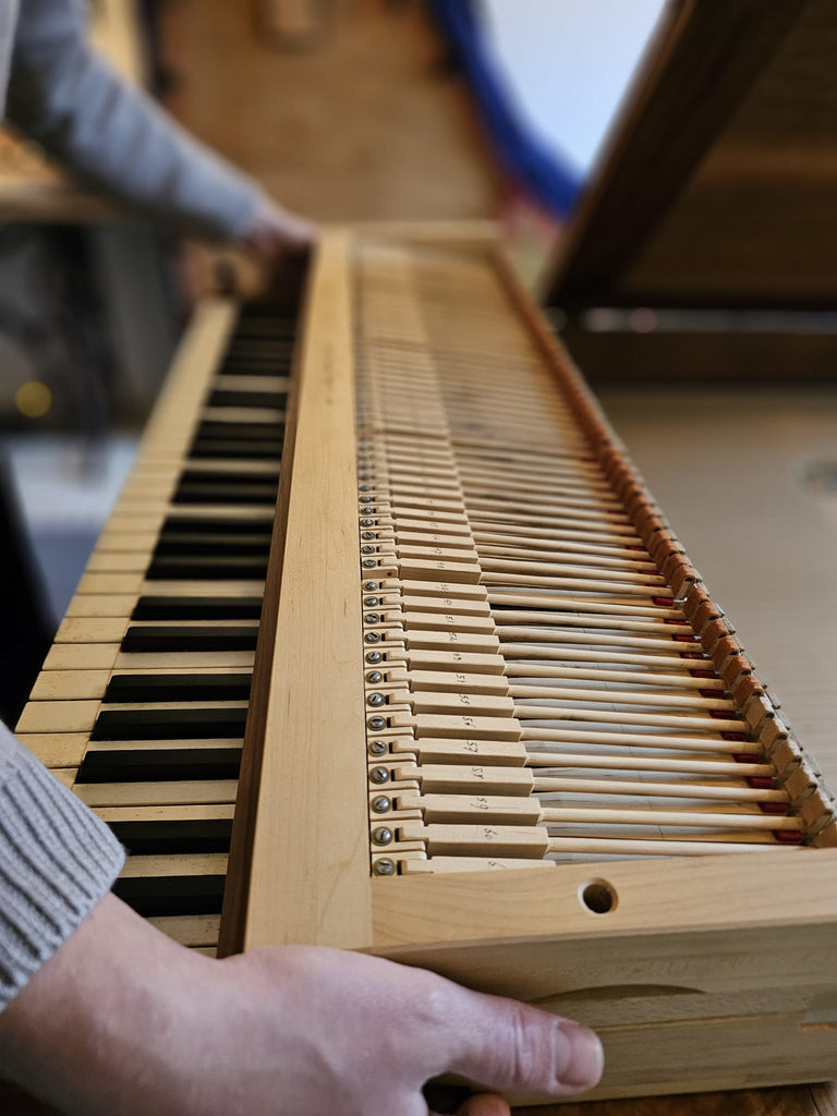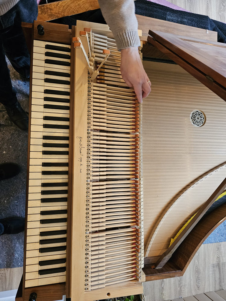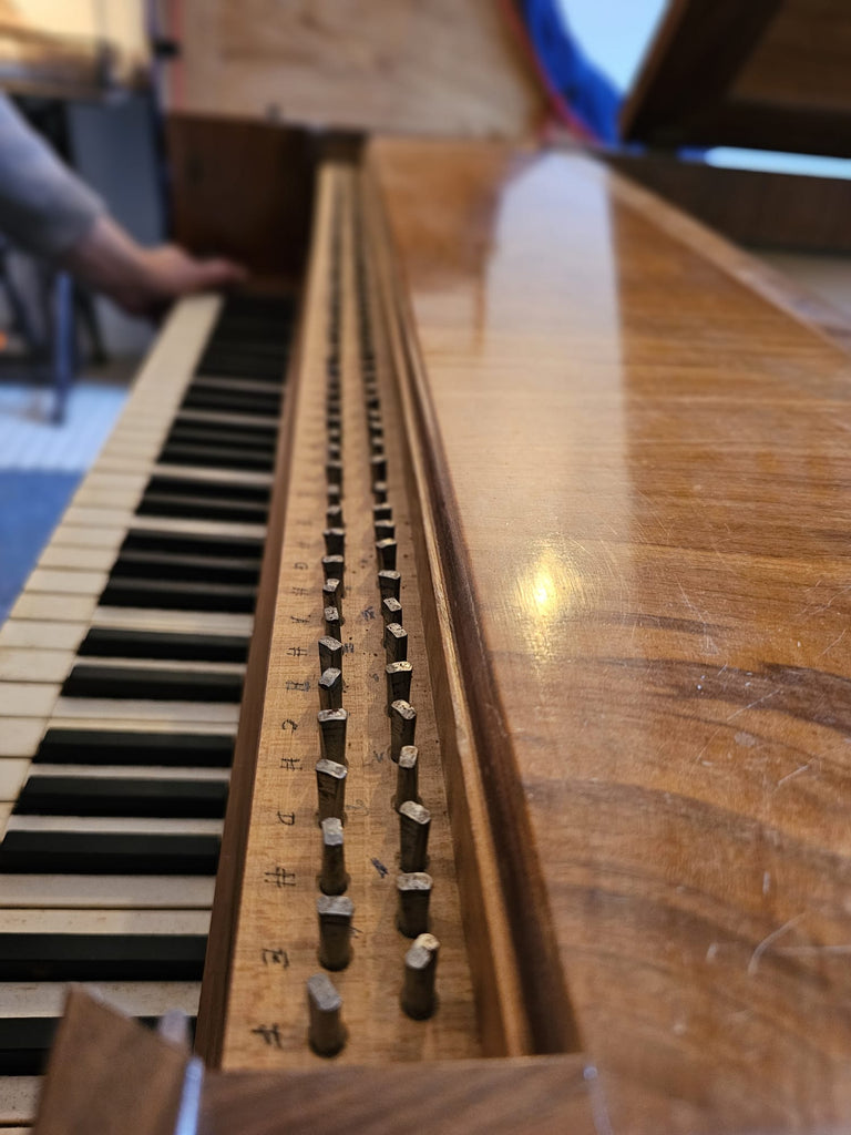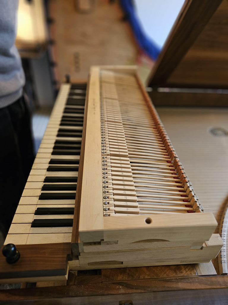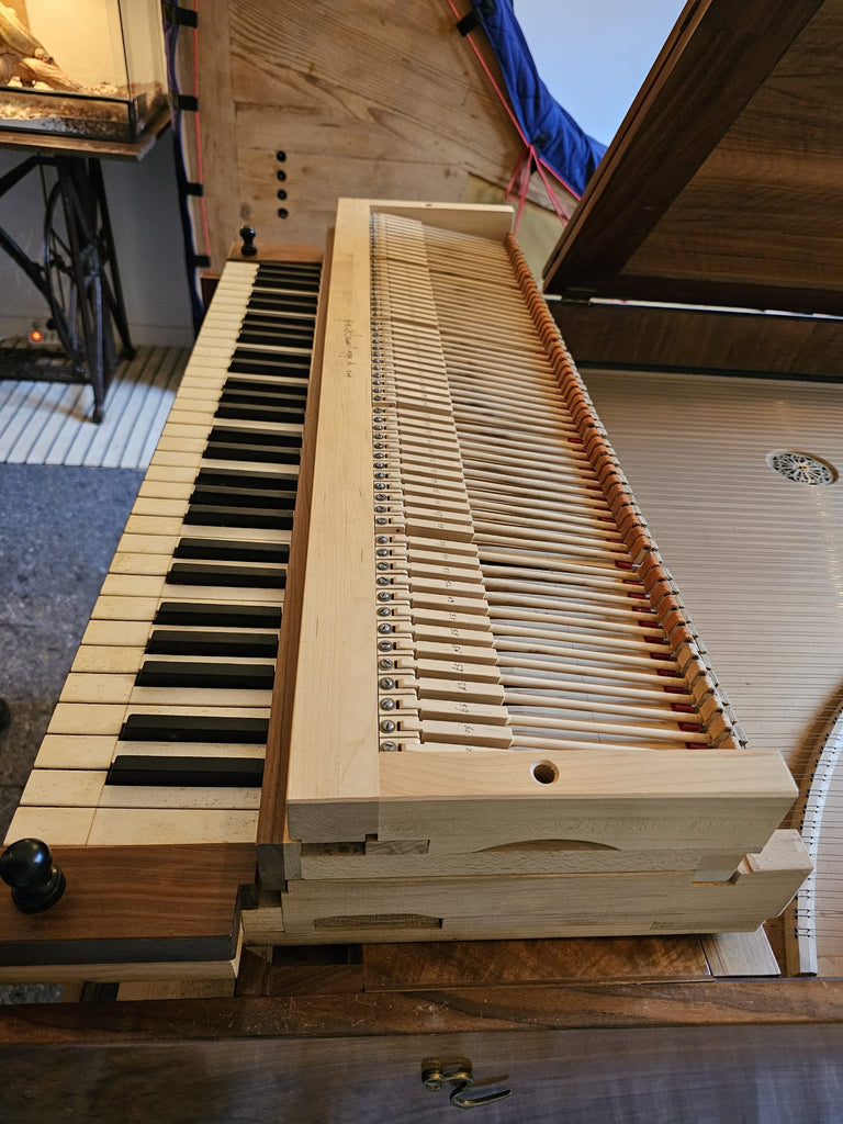 Fortepiano by Jan van den Hemel built in 1989 after Silbermann 1749 (Germanisches National Museum in Nuremberg). The instrument is double strung throughout. Keyboard is FF- f"' of bone and ebony. Case in crotch walnut with inset panels. Full turned table stand. Recorded on 5 CD's by Miklos Spanyl and Jacques Ogg. Priced at 25,000 Euro. Currently located in Ghent, Belgium, please e-mail to discuss the instrument and pricing.